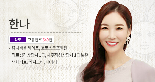 신규 상담사 "[타로] 한나 549번" 선생님이 새롭게 등록되었습니다.